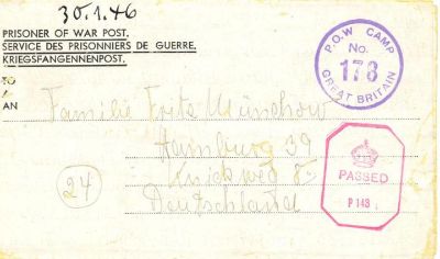 Die Angehörigen in Hamburg erhielten den Brief am 26.01.1945. In der Zwischenzeit ist Bruhn in ein ständiges Lager eingewiesen worden. Im Verlauf des Januars 1945 schreibt er aus dem neuen Camp No. 178 drei Karten nach Hamburg .