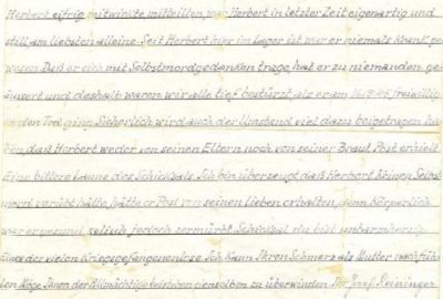 Mit diesen Zeilen erfülle ich die traurige Pflicht, Ihnen mitzuteilen, daß Ihr Sohn am 16.9.1945 in unserem Lager verstorben ist. Hierbei möchte ich nicht versäumen, Ihnen im Namen des P.O.W. Camp 28 mein tiefes Beileid auszusprechen. Ihr Sohn Herbert erfreute sich allgemeiner Beliebtheit, insbesondere durch sein eifriges Mitwirken in der Theatergruppe. Sein frühzeitiger Tod war auch für uns ein bedauerlicher Verlust. Seine sterbliche Hülle wurde in feierlicher und sehr anständiger Form beigesetzt. Eine Abordnung der Kameraden, darunter auch ich, war zugegen. Wertsachen hatte Herbert nicht in Besitz. Sollten Sie den Wunsch haben, von mir nähere Einzelheiten zu erfahren, so bin ich später, wenn ich daheim bin, gern bereit, mit Ihnen in Schriftwechsel zu treten.