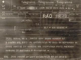 Kennummer B 304732 Uffz. Bruhn Herbert 12 I Div/Pi Btl 12/3 PI KP/101/8/JR 47 Verstorben 16. 10. wegen Selbstmord durch Erhängen. Stiefvater Fritz Münchow, Hamburg 39 Knickweg 8, Prisoner of War Informationsbüro.